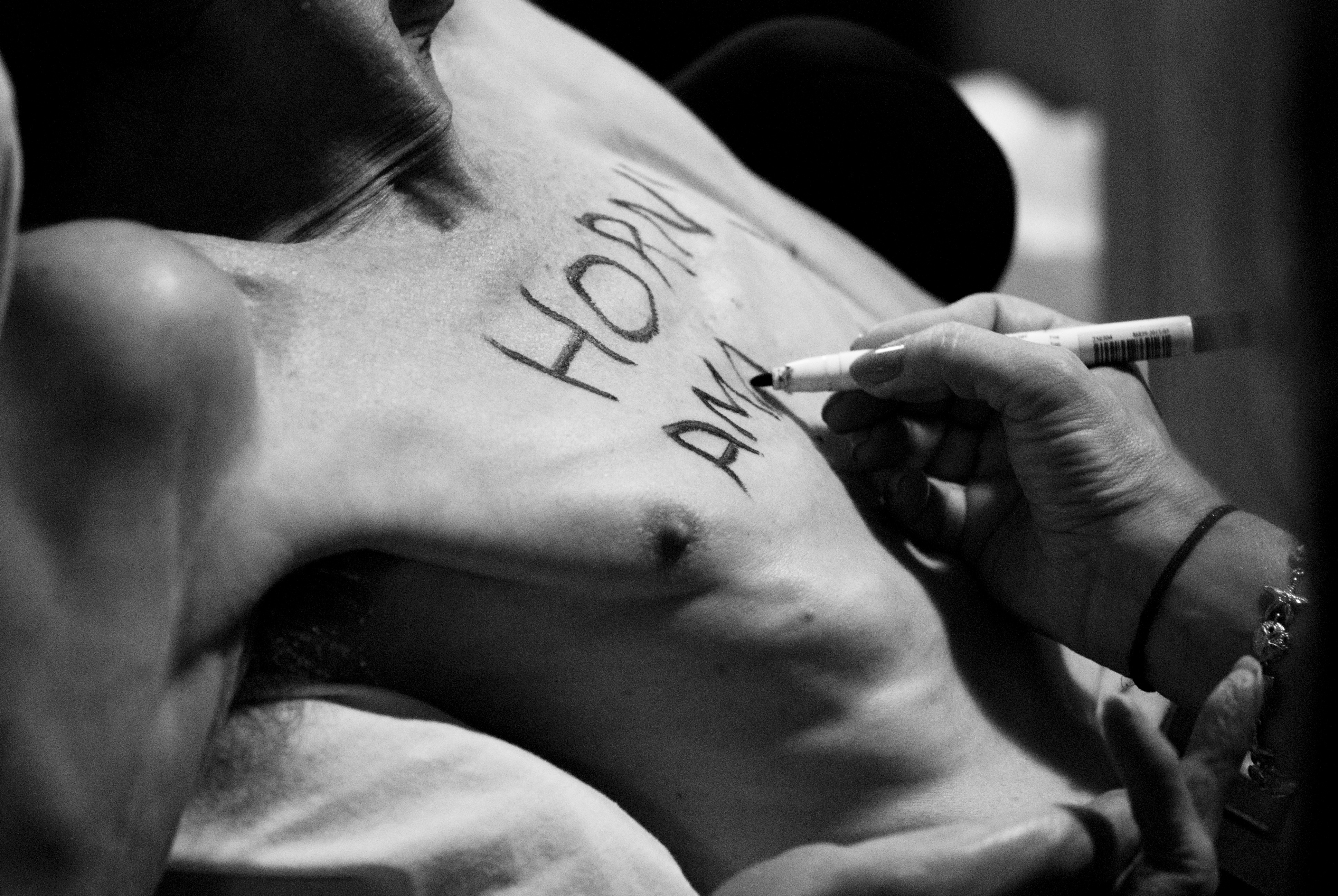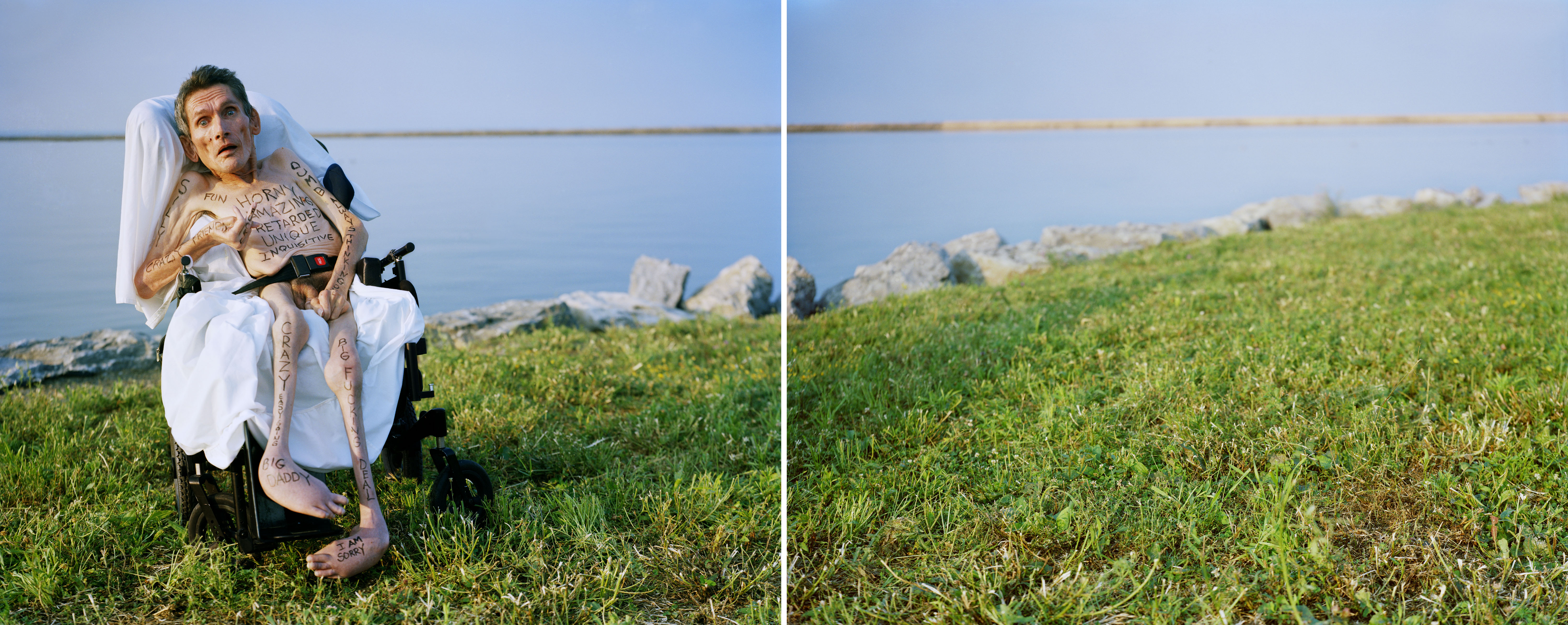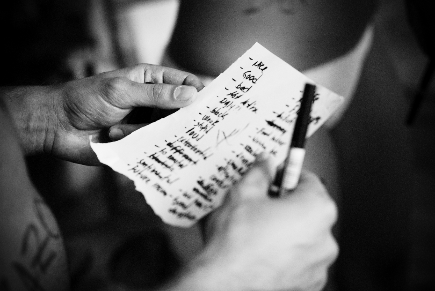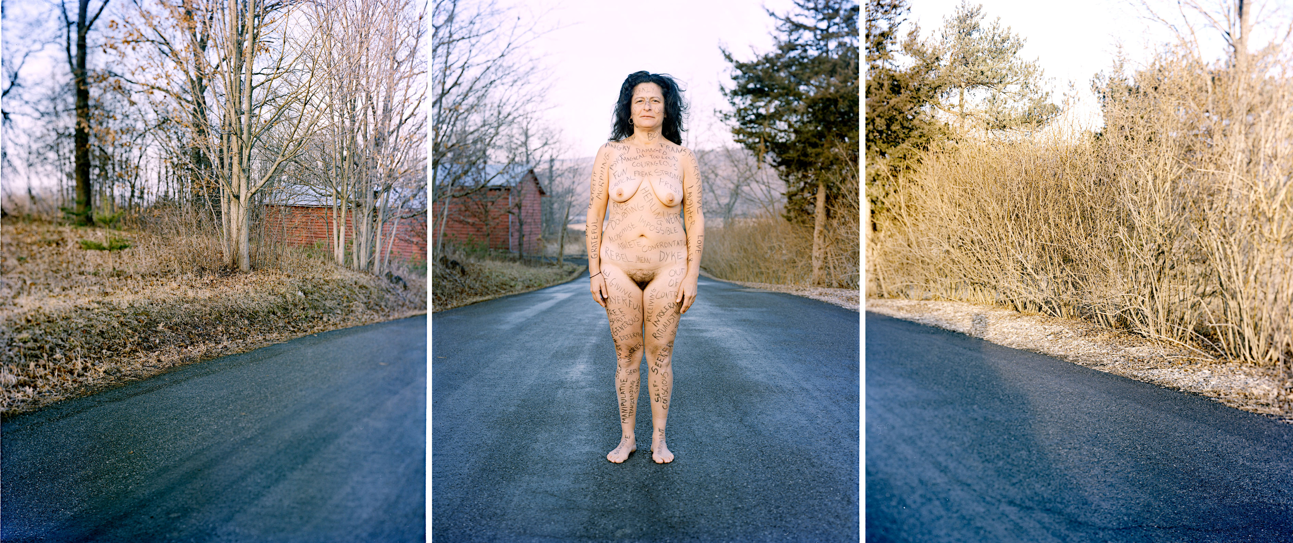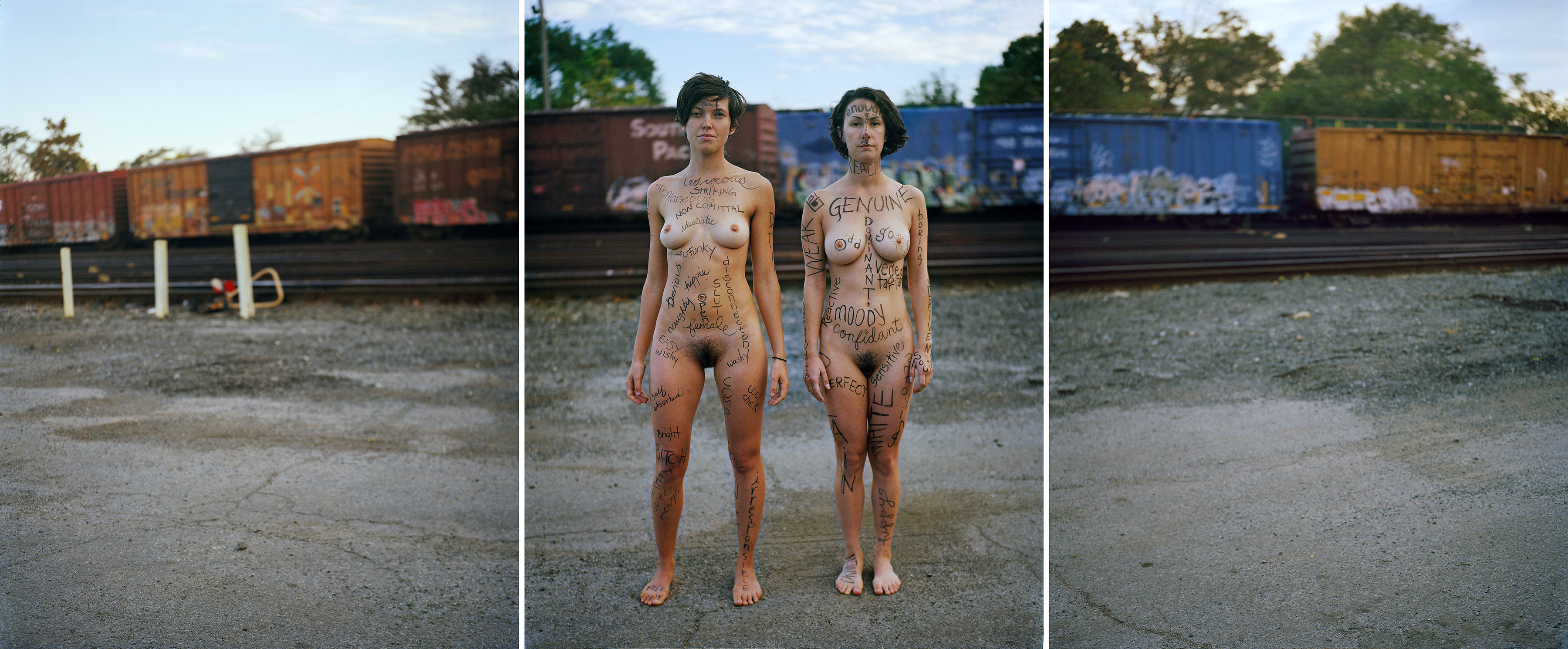 Volunteers arrive on the day of the shoot with a pre-written list of words that they’ve been labeled as throughout the course of their lives, are asked to remove their clothes, and encouraged to write the words on each others’ naked bodies from head to toe. After doing so, they’re photographed in a public space with a 4x5” view camera - a symbolic act that honors the wholeness of each individual, as well as the unity of the group after being bonded together by the body writing experience.